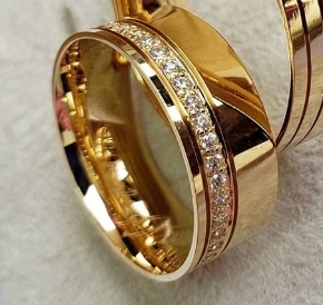 ALIANÇA DE MOEDA 8 MM 2 FRISOS C/ 15 PEDRAS