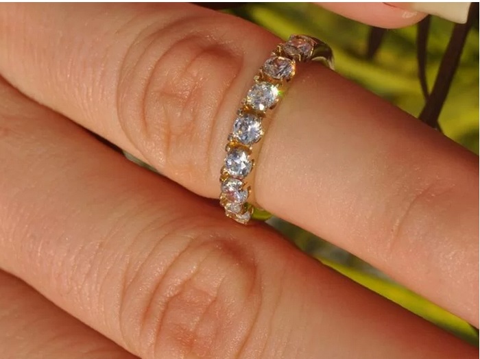 ANEL DE MOEDA MEIA ALIANÇA COM 7 PEDRAS DE 3MM