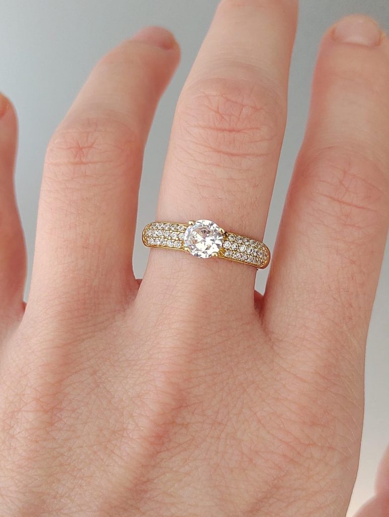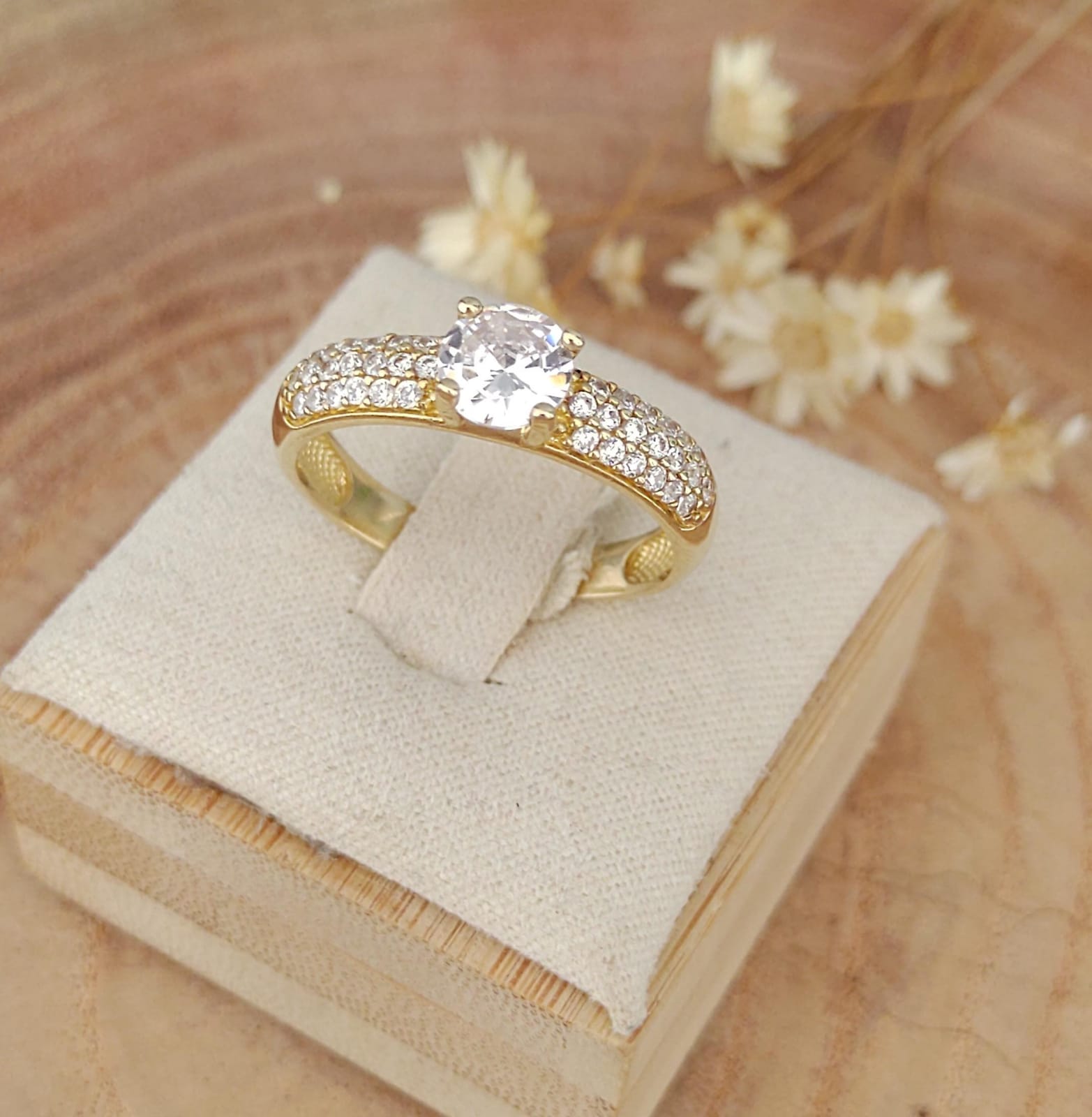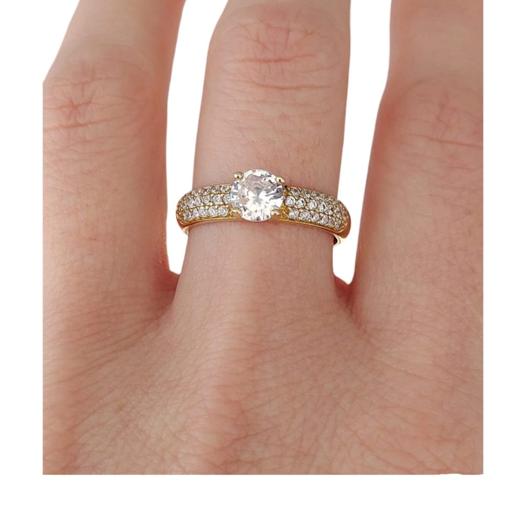 ANEL SOLITARIO LUXO 3 CARREIRAS DE PEDRA E PEDRA CENTRAL 6MM